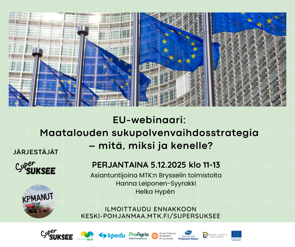 Webinaarissa käsitellään Euroopan komission 21.10.2025 julkaisemaa Maatalouden sukupolvenvaihdosstrategiaa (Strategy for generational renewal in agriculture). Millainen strategia on ja mitä eväitä se antaa tulevaisuuteen? Miten komission antamat strategiat toimivat ja millainen merkitys niillä on päätöksenteossa? Millainen on MTK:n vaikutusmahdollisuus? Aihetta alustamassa ovat Hanna Leiponen-Syyrakki ja Helka Hypén MTK:n Brysselin toimistolta.