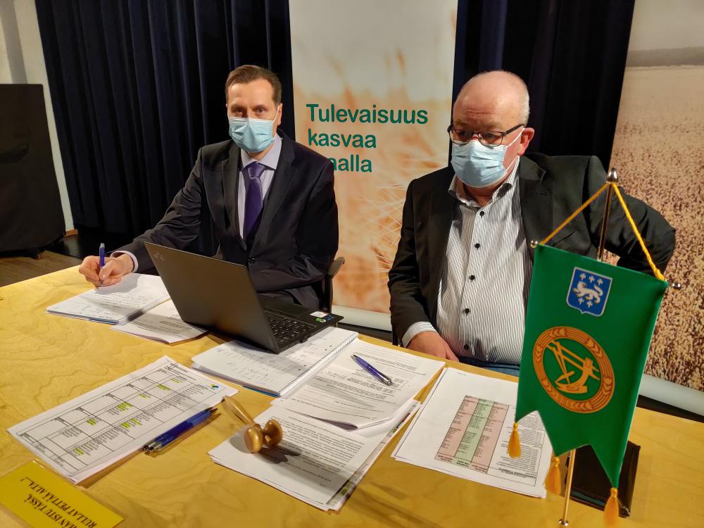 Kokouksen sihteeri toiminnanjohtaja Jan-Ove Nyman sekä kokouksen puheenjohtaja maanviljelijä Markku Pajala Kälviältä