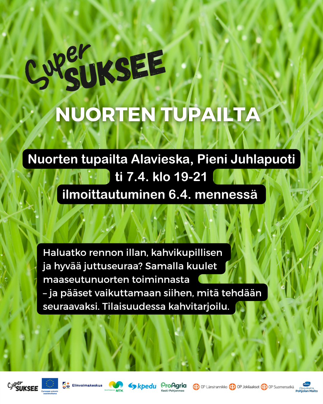 Illan aikana kahvitellaan ja keskustellaan maaseutunuorten tominnasta sekä kuullaan ajankohtaisia asioita SuperSuksee -hankkeesta. Tule mukaan verkostoitumaan ja ideoimaan tulevia tapahtumia.