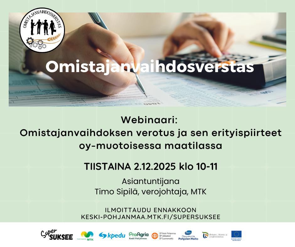 Omistajanvaihdosverstaan webinaari 2.12.2025: "Omistajanvaihdoksen verotus ja sen erityispiirteet oy-muotoisessa maatilassa" - MTK-Keski-Pohjanmaa